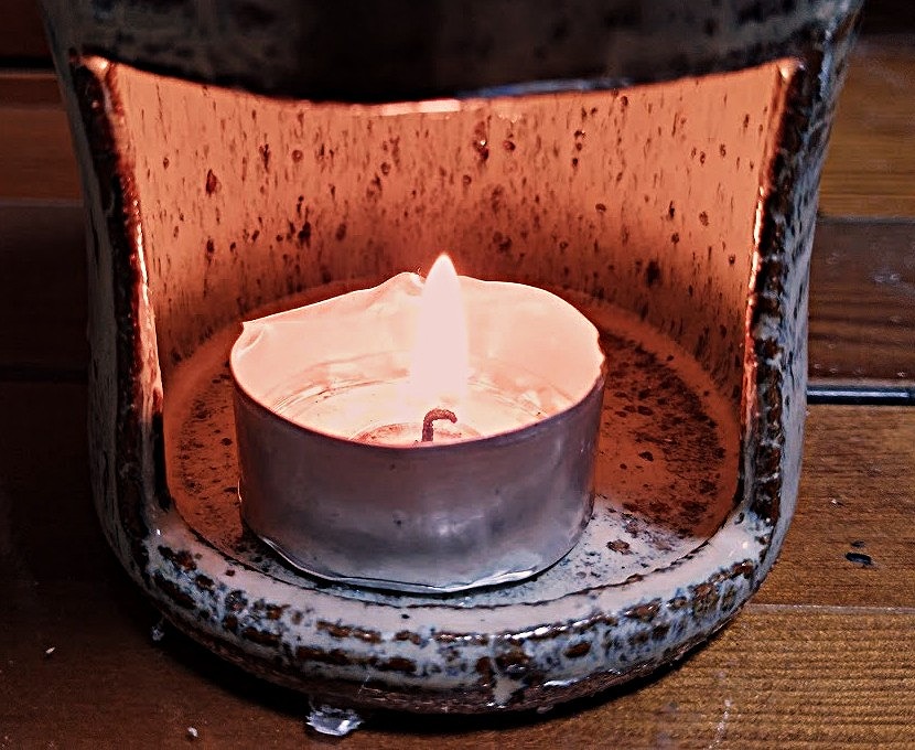 皿にダシガラを入れ、tea lightに点火し、匂いがほのかに立ち上るのを待つ。